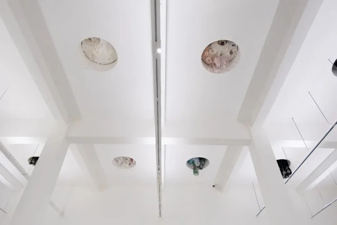 Outside and inside the exhibition hall, there is a flesh-colored horn named "Xiuzhen Pink". This breathing apparatus is clamped by huge steel pipes, with its broken wounds and needles shocking to the eye. Submerged Throat is a series of works made from the same material, connects the inside and outside of the exhibition. When viewers try to look out through the holes, they don't see a straightforward view, but rather the reflection of the surrounding environment in the opposite mirror of the horn and the glass balls in the shallow throat.
